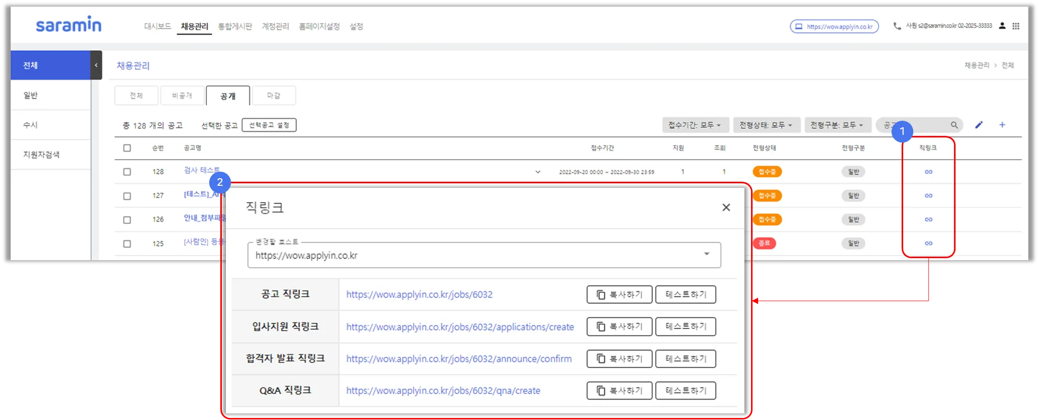 - 접근경로 : 관리자 로그인 > 공고명 우측에 위치한 직링크 아이콘(①) 클릭 > 직링크 창 생성(②)