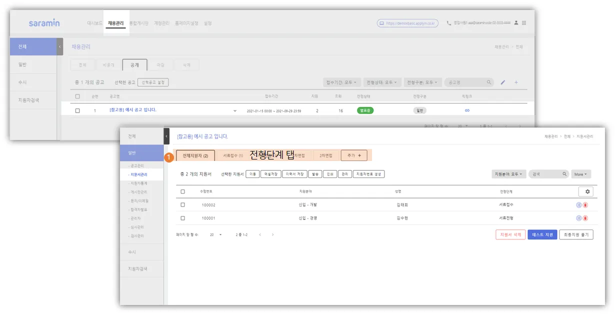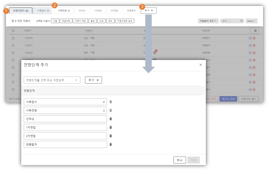 ① 전형단계 위치 : 전형단계별로 지원자를 분류하여 지원자 관리 가능