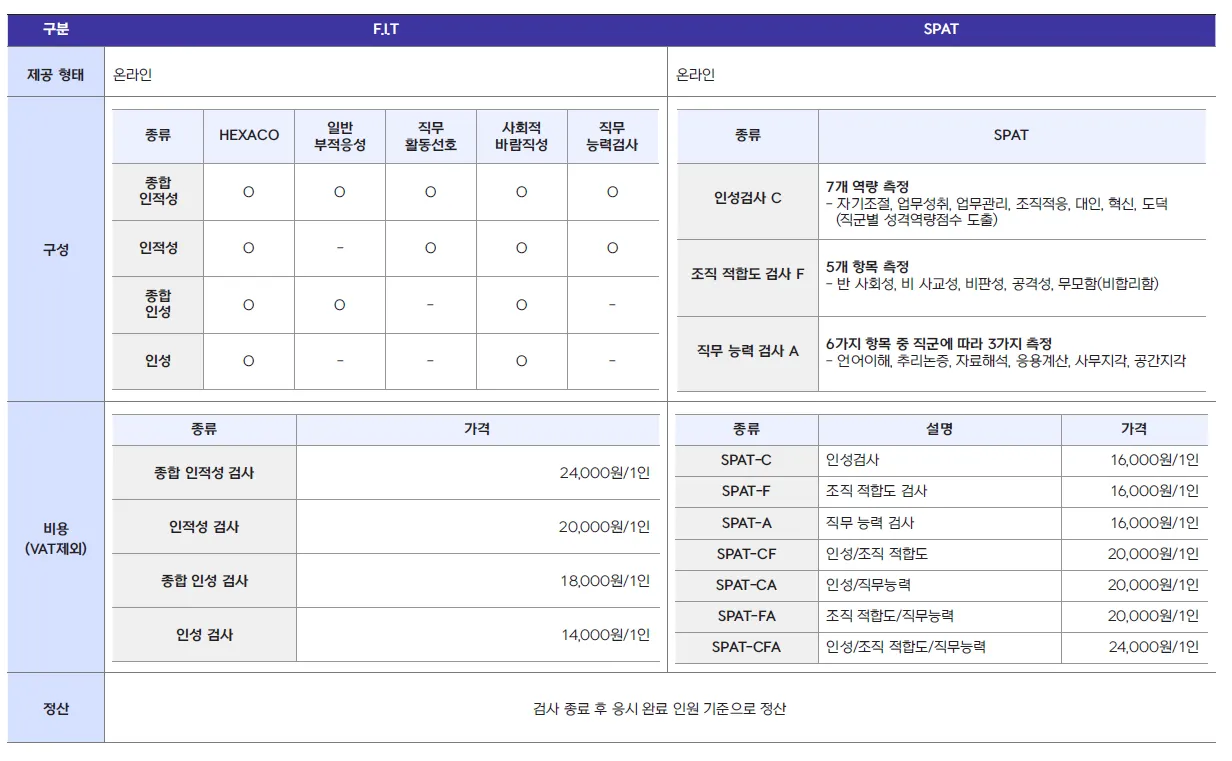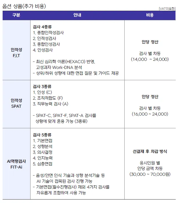F.I.T 인적성검사 세부상품별 1인당 비용