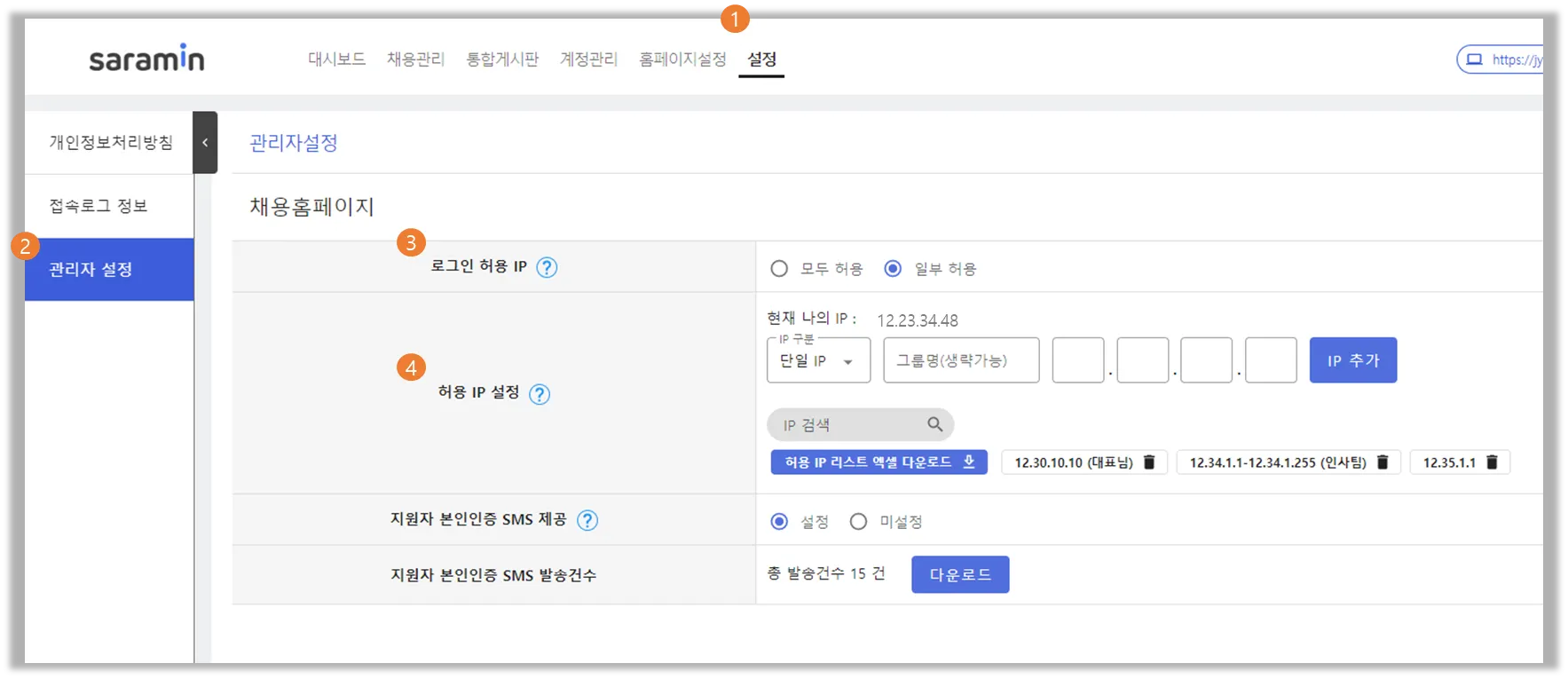 ③ 로그인 적용 IP : 관리자 페이지의 로그인 허용 IP를 선택할 수 있습니다.