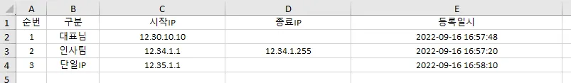 허용 IP 리스트 엑셀 다운로드 : 설정된 IP 엑셀 다운로드 기능 (예시 하단 이미지 참조)