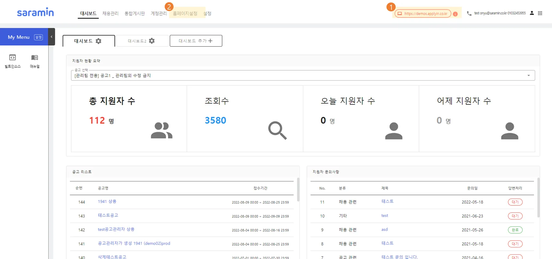 2) 홈페이지설정 메뉴 : 빌더에 접속하기위해서는 해당 메뉴 클릭