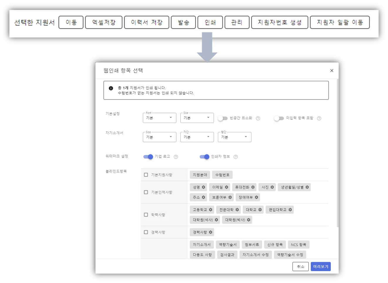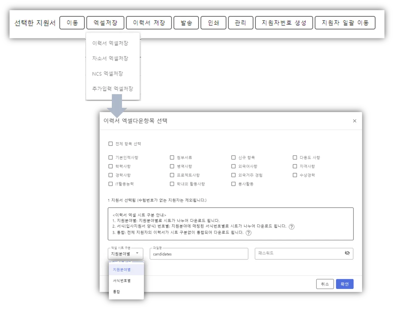 - 엑셀 다운받을 때에는 지원분야별, 서식번호별, 통합(해당 공고의 모든지원자) 구분하여 다운 가능