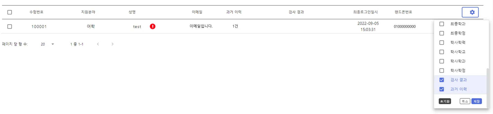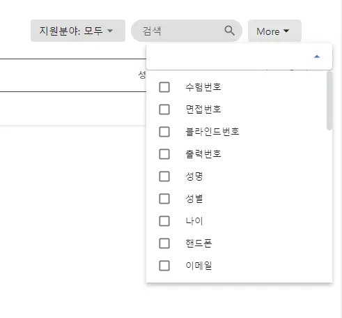 지원자 리스트 우측의 [톱니바퀴(설정)]아이콘을 클릭하시면 리스트에 추가할 수 있는 항목들을 확인 할 수 있습니다.
