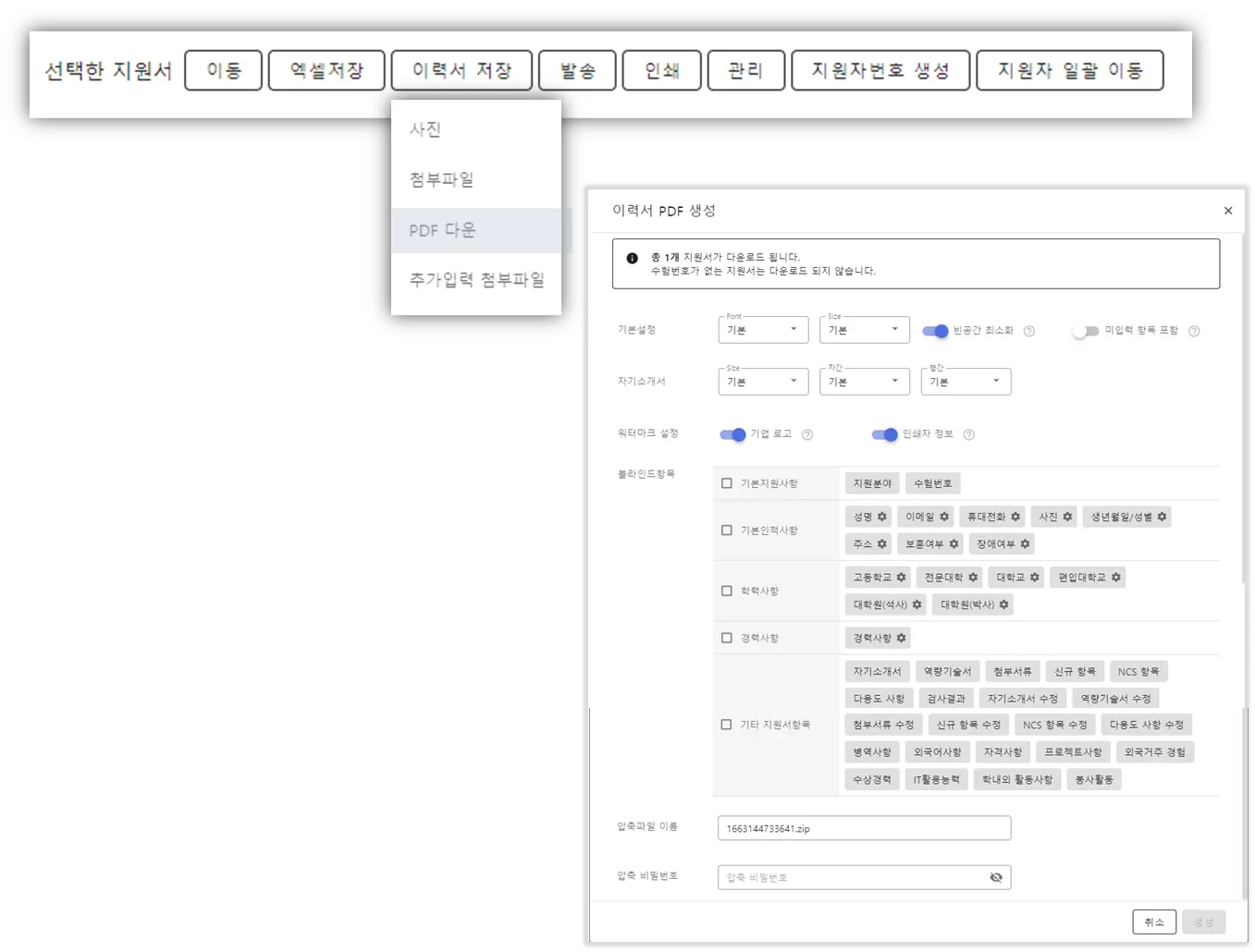 - 입사지원서는 pdf 로 이력서 뷰와 동일하게 다운로드 가능