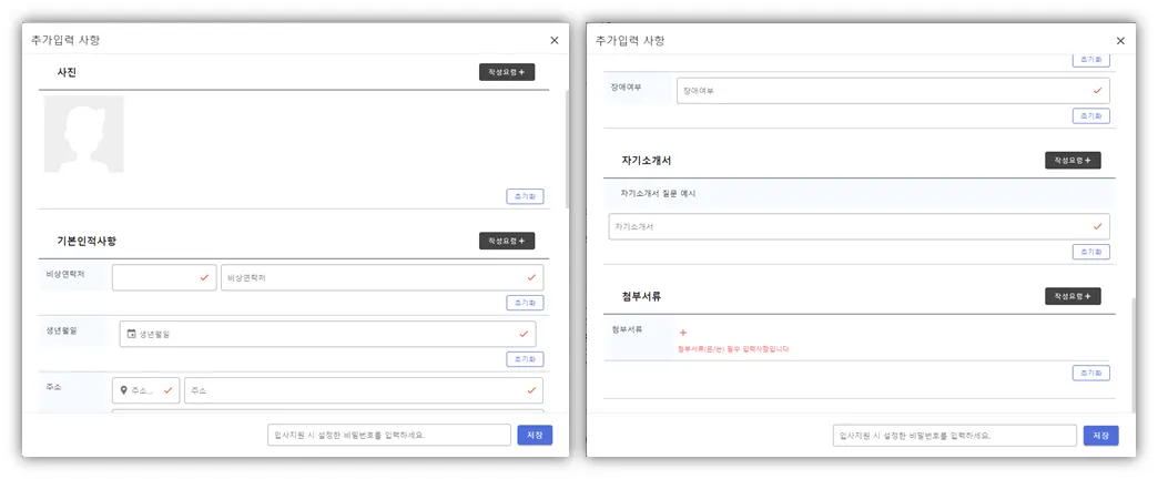 - 사진, 기본인적사항 중 기존 입사지원서에서 이미 사용한 항목은 세팅이 불가함