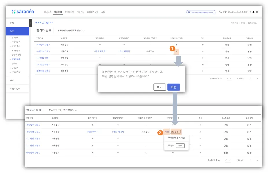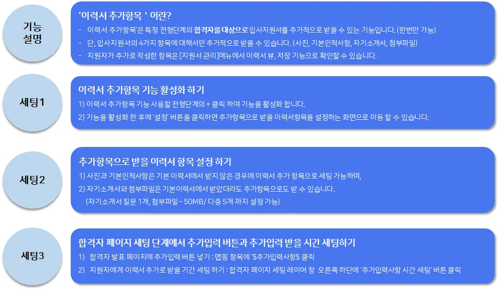 ① 이력서 추가항목 기능 활성화 하기 : 합격자 대상으로 이력서를 추가로 받을 전형단계라인