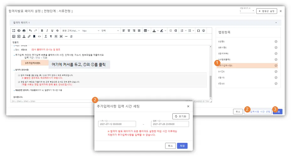 합격자 페이지 세팅화면에서 '맵핑항목'영역에 $추가입력사항$ 버튼이 생김