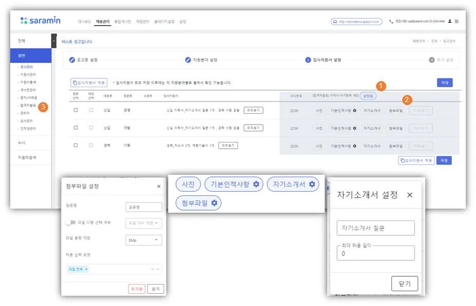 2) 설정 클릭 : 추가로 받을 이력서 항목 세팅하는 화면으로 이동 가능함