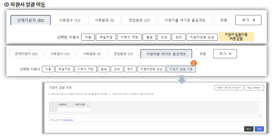 ② 지원서 일괄 이동 : 대량의 지원자를 이동해야할 때 사용