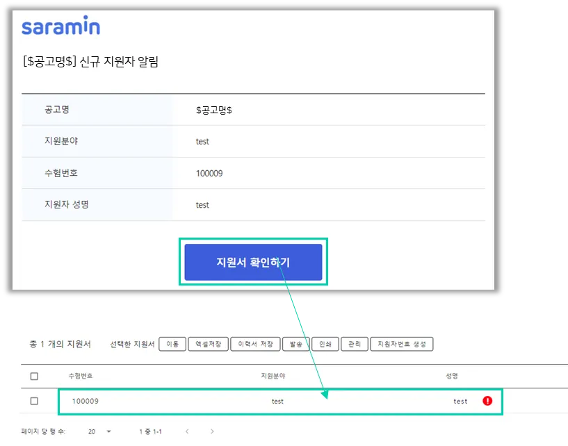 해당 메일에서 [지원서 확인하기] 버튼을 누르면, 관리자 로그인 후 해당 지원자만 필터링되어 표출되니 편리하게 신규 지원자를 확인하세요!