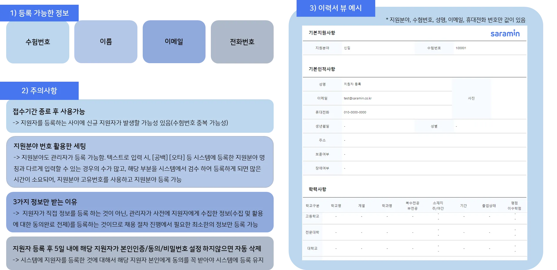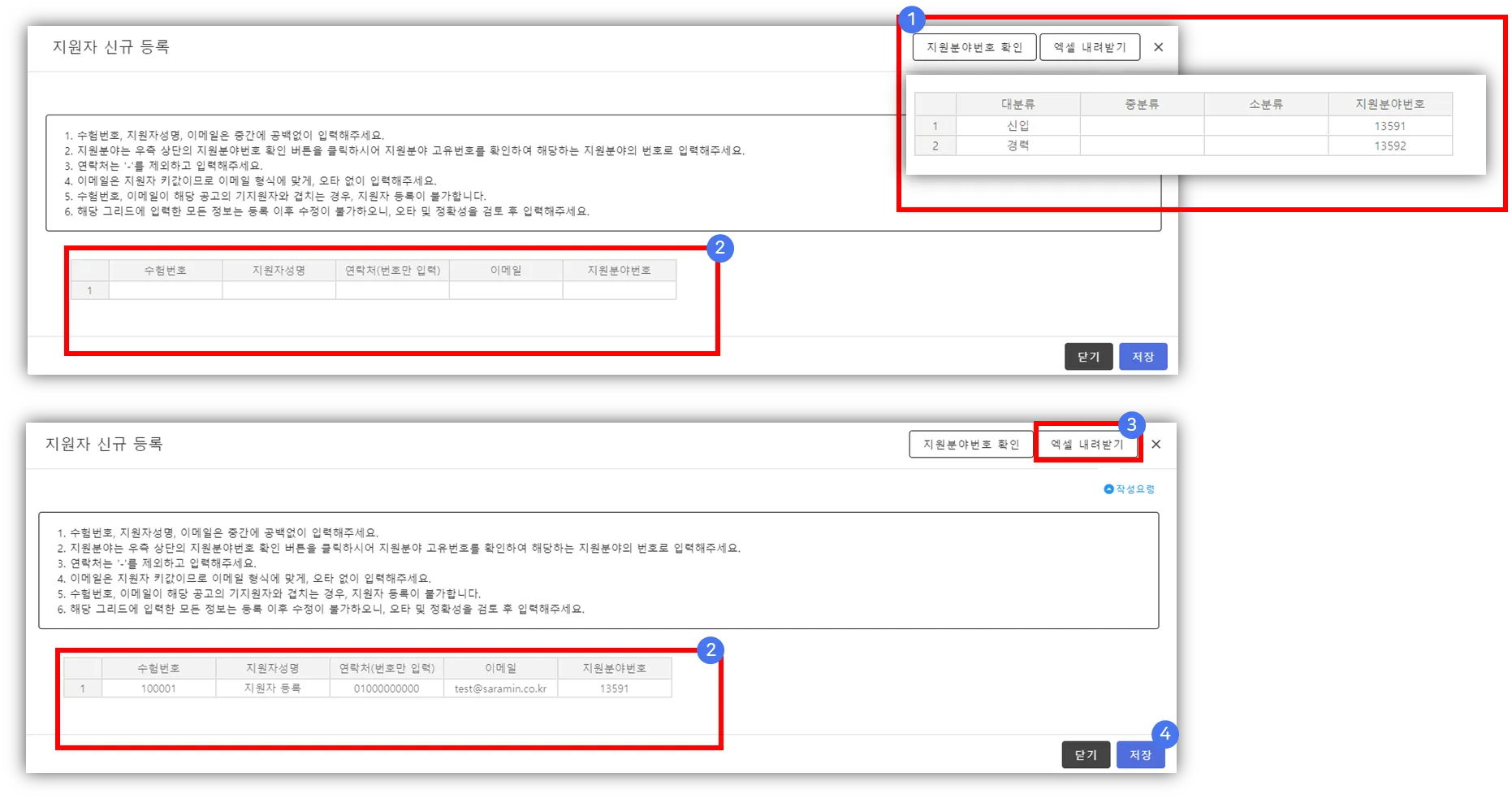 ② 지원자 정보 입력 : 사전에 엑셀에 미리 데이터를 정리하시어 검수 후에 등록하시는 것을 추천 드립니다.