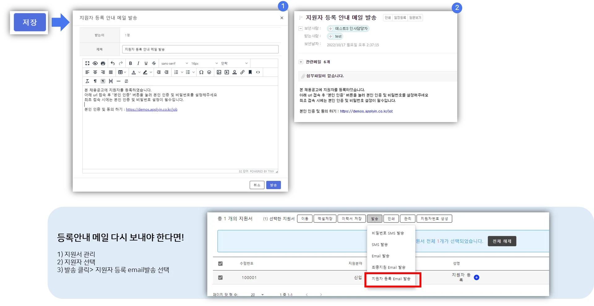 ① 지원자 등록 안내 메일 발송 : 앞선단계에서 엑셀그리드 저장 클릭 > 지원자 등록 안내 메일 발송 창이 바로 열림