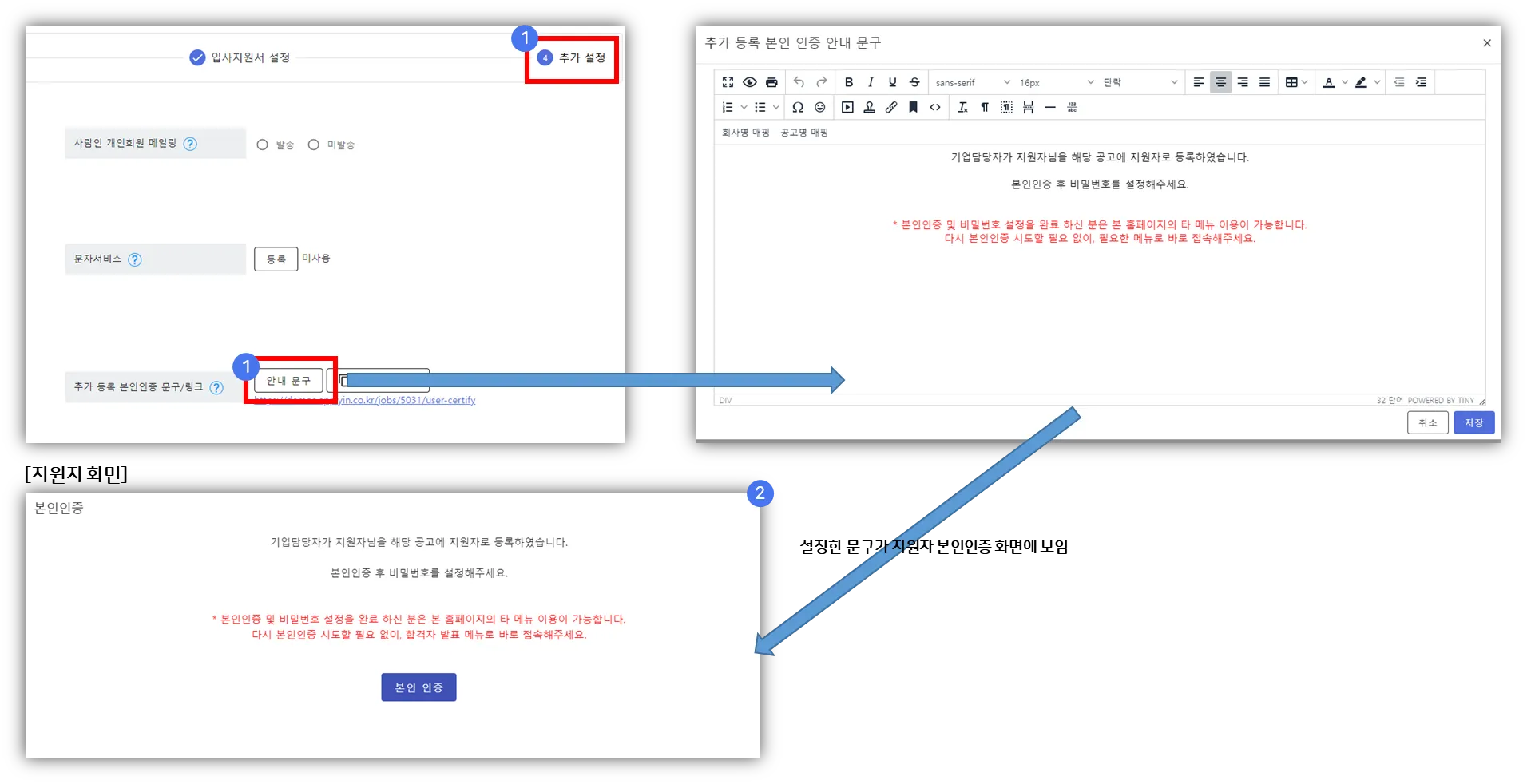 ① 공고 관리 > 4단계 추가설정 > 추가등록 본인인증 문구/링크 : 안내문구 버튼 클릭 > 안내문구 수정 가능