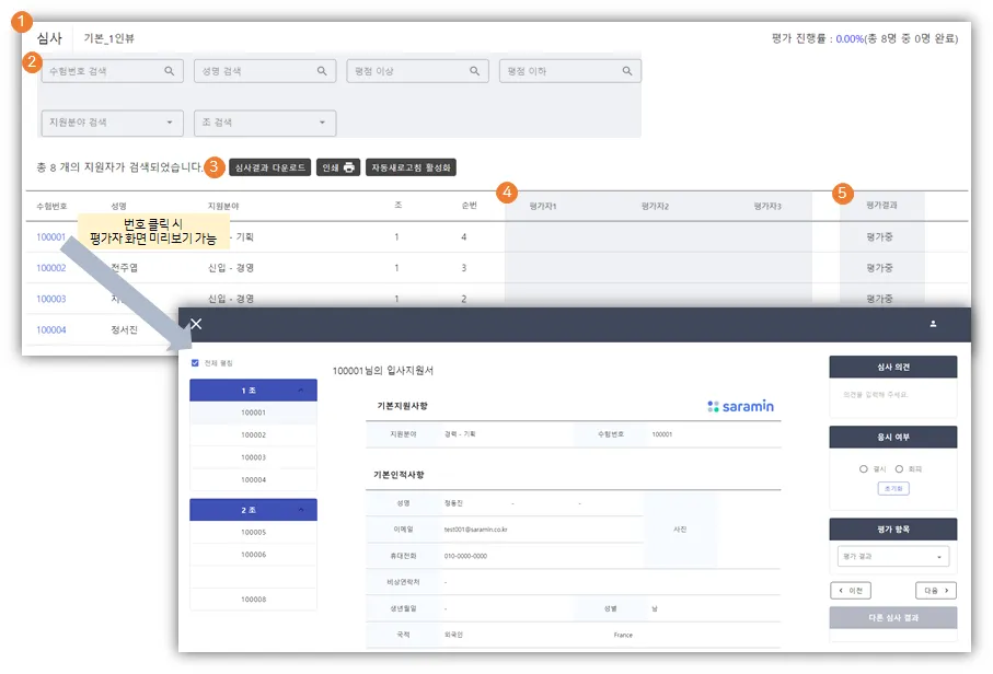 - 화면 위치 : 심사 리스트 > 심사명 클릭 > 심사 상세 리스트확인 가능