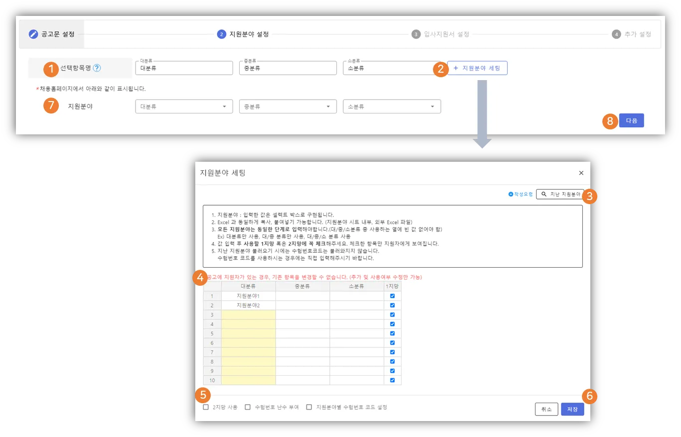 ① 선택항목명 : 지원분야 뎁스 명칭 ⇒ 타이핑하면 명칭 변경 가능합니다.