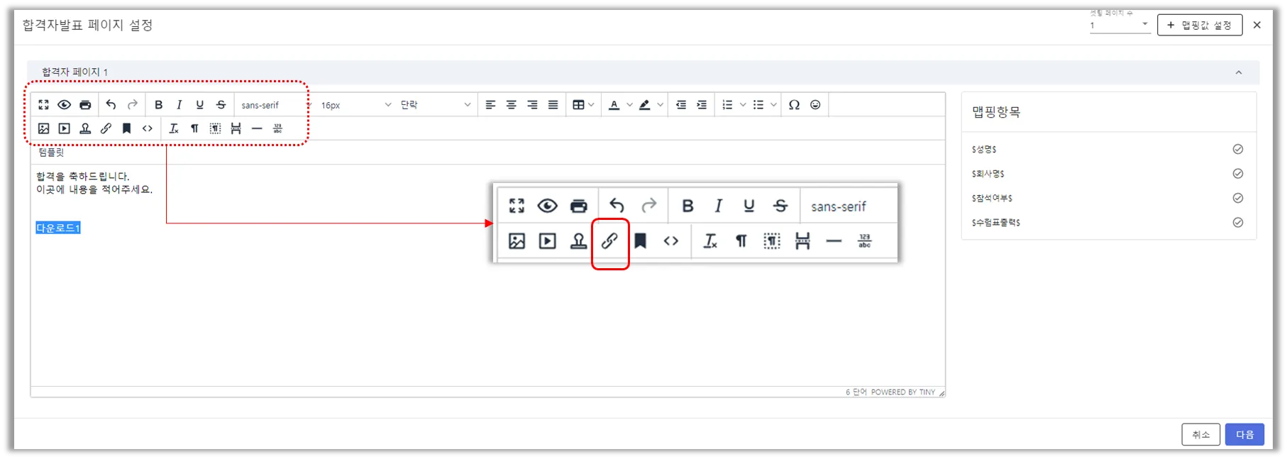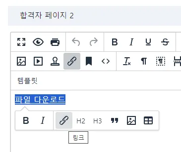 [① 합격자발표 페이지의 에디터에서 ‘링크 삽입/수정’ 버튼 이용하기]