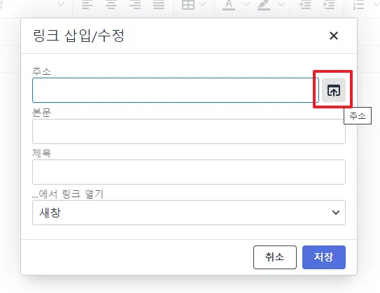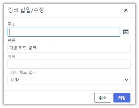 - 해당 버튼을 클릭하면 ‘링크 삽입/수정’ 창이 생성됩니다.