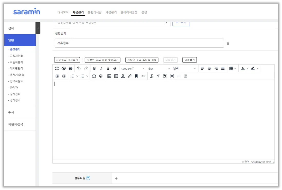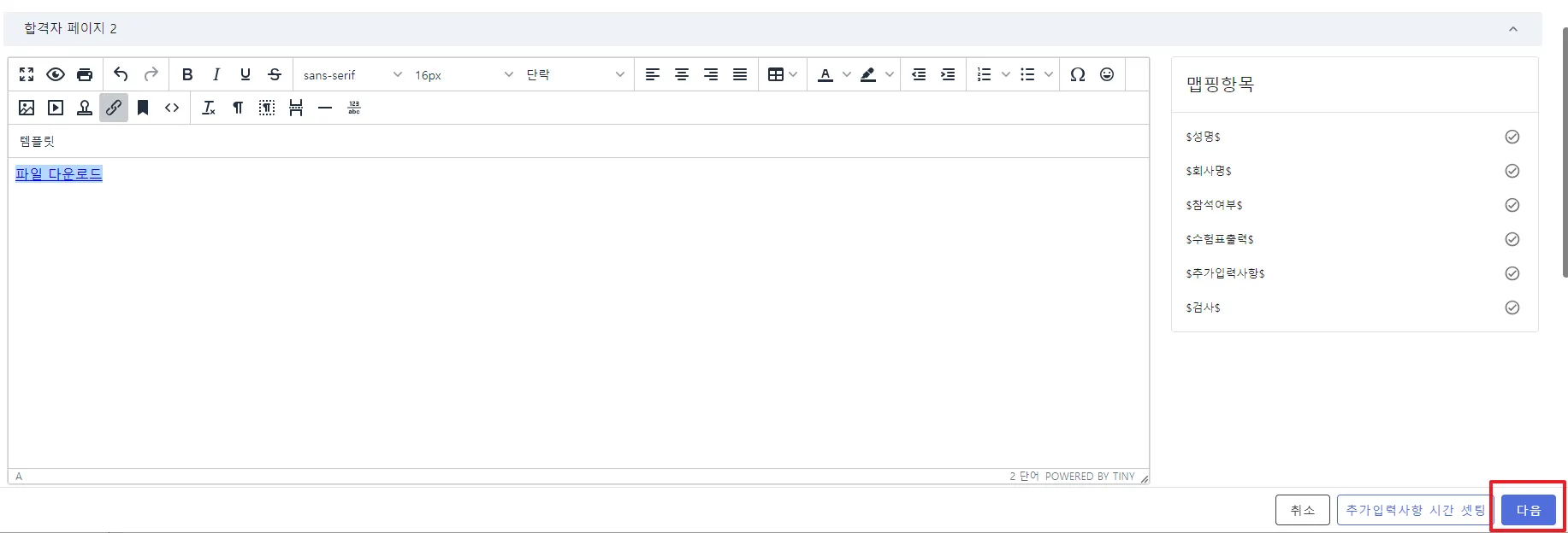 지원자에게 메일 발송 시 첨부파일을 포함하고 싶을 때 또는 공고문, 합격자 발표 페이지, 통합게시판 및 게시판 등 지원자에게 노출되는 페이지를 세팅하는 단계에서 특정 텍스트 또는 이미지에 첨부파일 다운로드 링크를 심을 수 있는 기능입니다.
