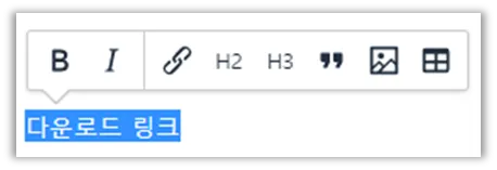 첨부파일 다운로드 링크를 걸고자 하는 텍스트를 드래그만 한 경우 아래 이미지와 같이 텍스트 위에 에디터 바가 표시되며, ‘링크’ 버튼을 사용하는 방법도 있습니다.