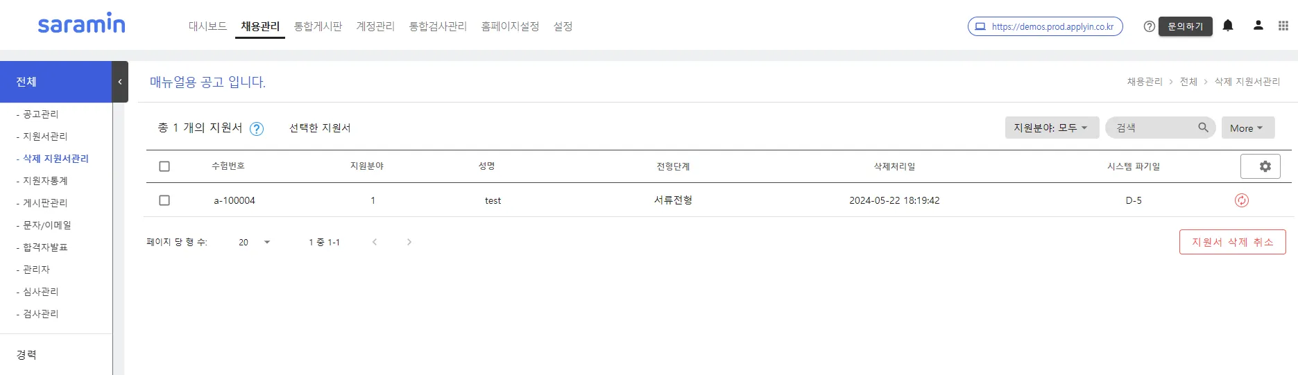 공고관리자도 삭제 지원서 관리 메뉴에 진입이 가능하지만 삭제 취소 기능 사용은 불가합니다.