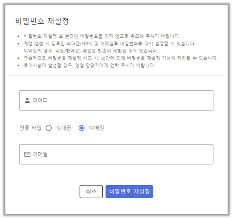 비밀번호 재설정을 수행하기 위해서는 사용자 인증이 필요합니다.