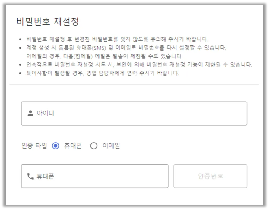 3. 비밀번호 재설정을 위한 인증(휴대폰 or 이메일)