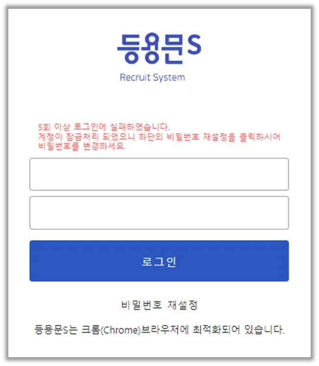 계정이 잠금처리 되어 로그인이 불가능한 경우 하단에 위치한 『비밀번호 재설정』을 클릭하여, 비밀번호 재설정 후 재로그인해주시기 바랍니다.
