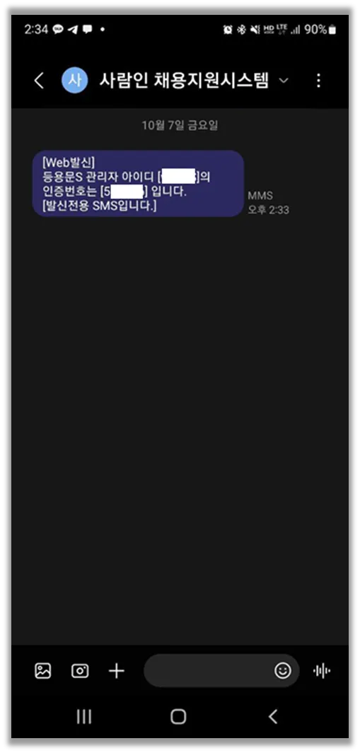 입력한 휴대폰 번호가 실제 계정에 등록된 정보와 일치한다면, 위 이미지(우)와 같이 비밀번호 변경용 인증번호를 문자(SMS)로 수신하게 될 것입니다.