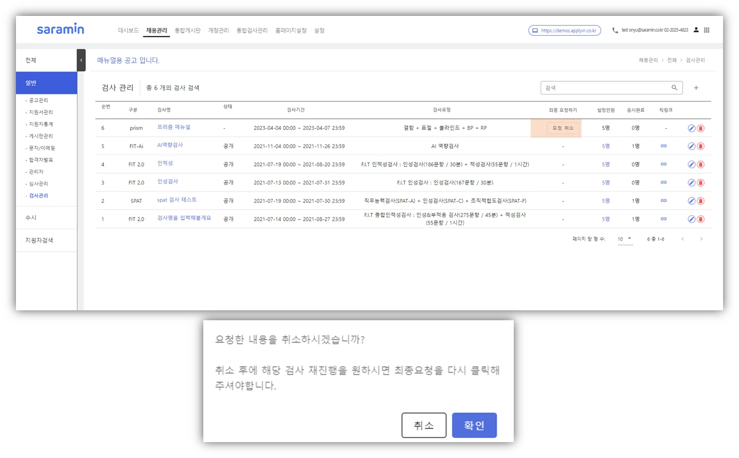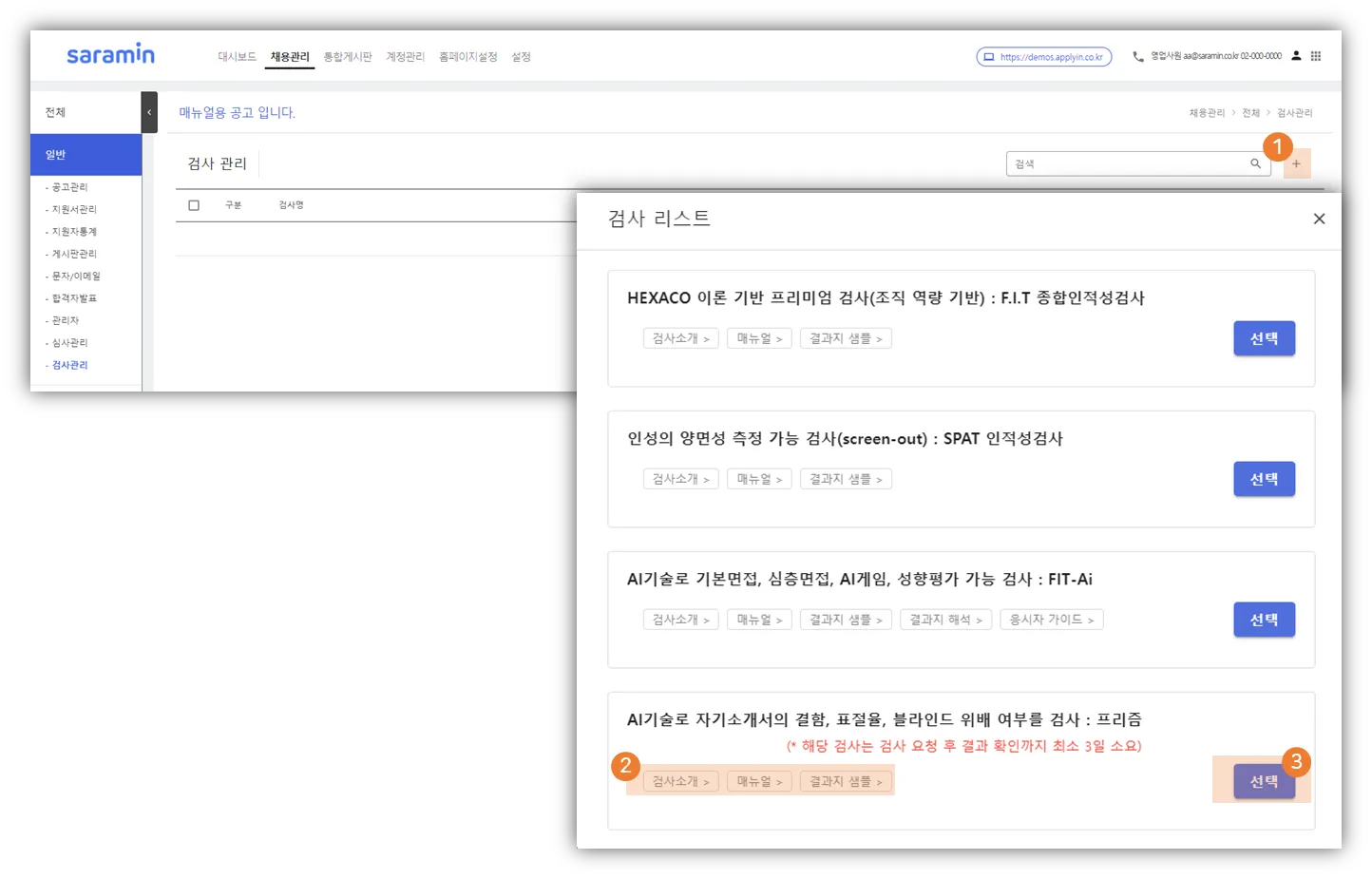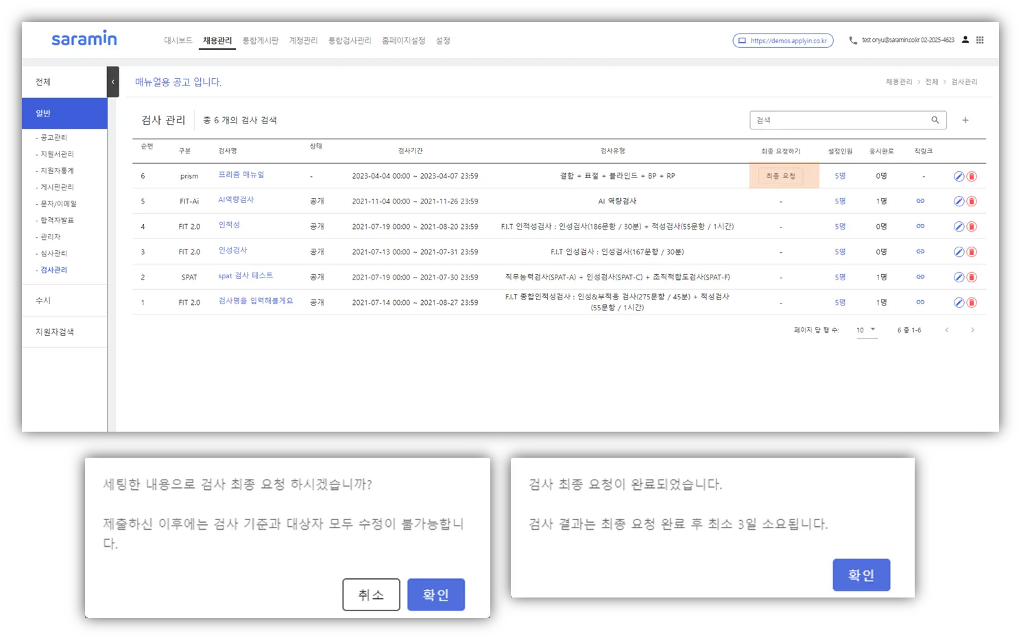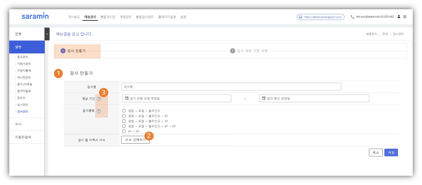 채용관리(상단메뉴) > 공고명 클릭 > 검사관리(좌측 메뉴) ⇒ 검사 관련 기능 이용 가능