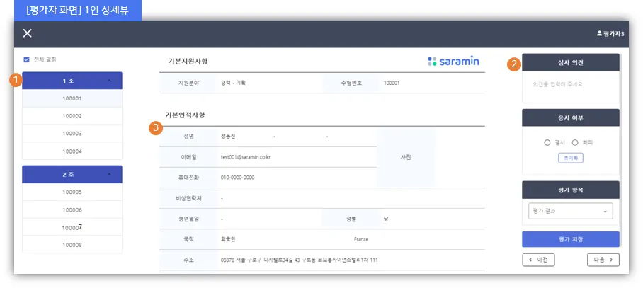 - 이전 / 다음 : 이전, 다음 지원자의 평가화면으로 이동