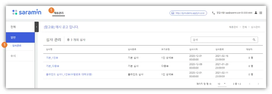 - 심사명 클릭 > 해당 심사의 평가자 리스트 화면으로 전환됨