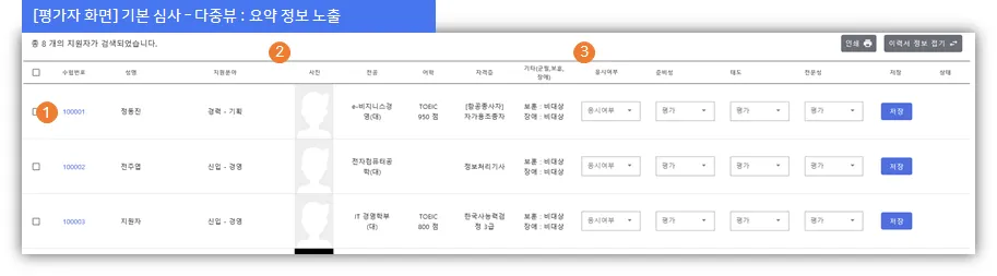 ① 수험번호(지원자번호) 클릭시, 지원자별 지원서 뷰 확인 가능