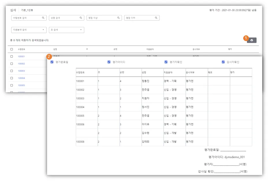 - 인쇄 옵션 제공 : 평가 완료일, 평가 아이디, 평가자 확인, 감사자확인