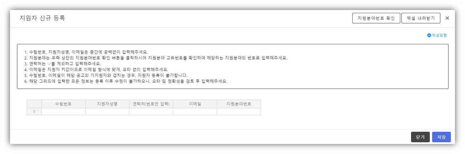 지원자 이름, 연락처, 이메일, 지원분야만 등록이 가능합니다.