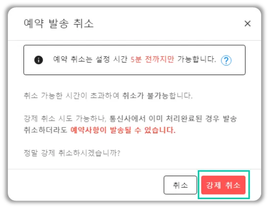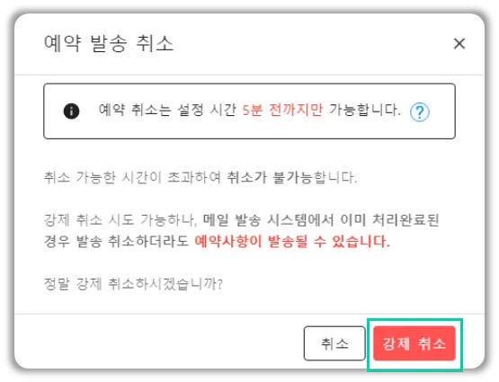 발송 예정 시간 5분 이내에 긴급하게 취소를 시도해야할 경우 [강제 취소] 기능을 제공하고 있으나, 취소 가능 여부는 통신사 혹은 메일 발송 시스템의 처리 상태에 따릅니다.