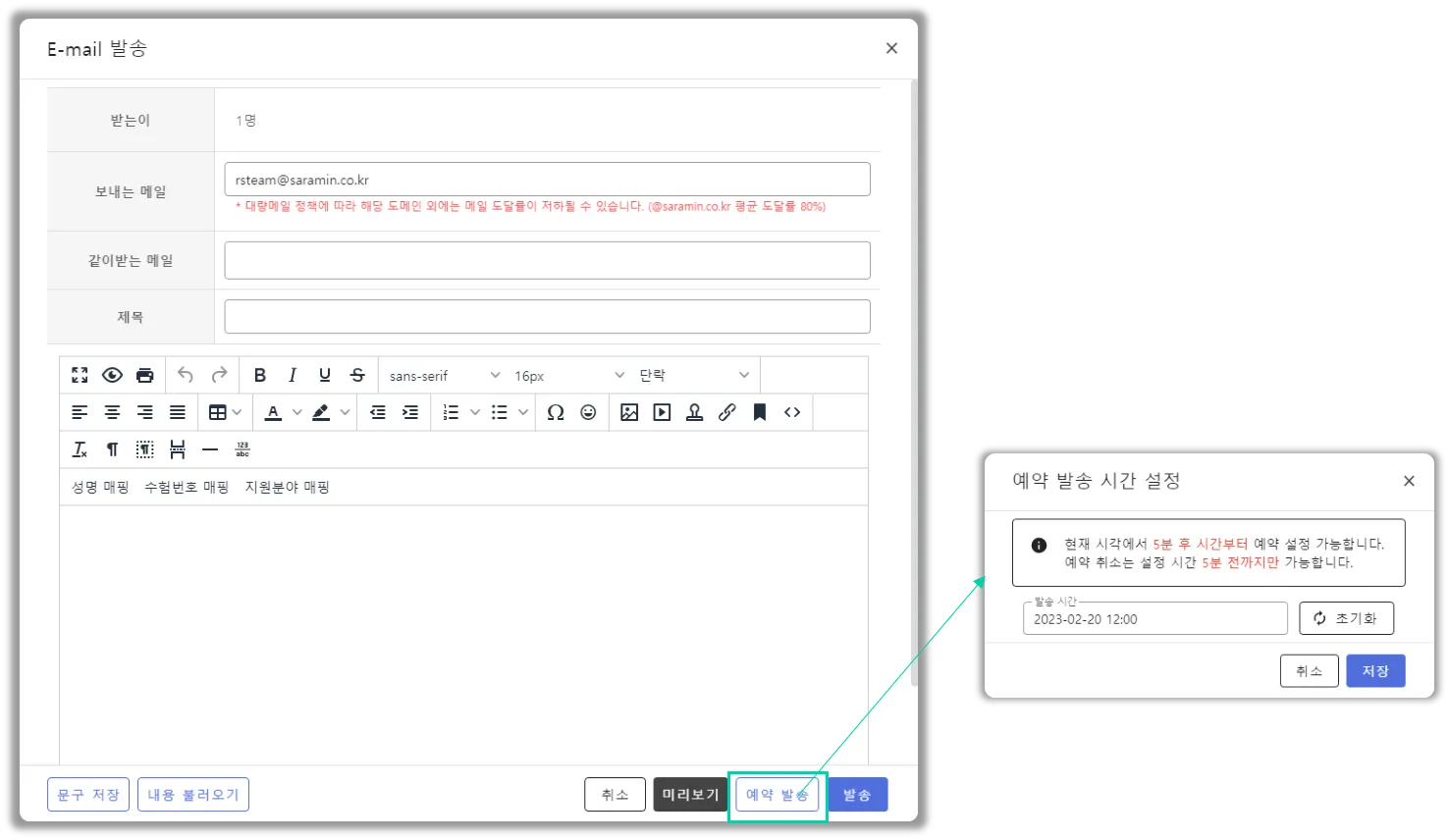 2. Email 예약 발송 : [발송] > [Email 발송] > 하단 [예약 발송] 버튼