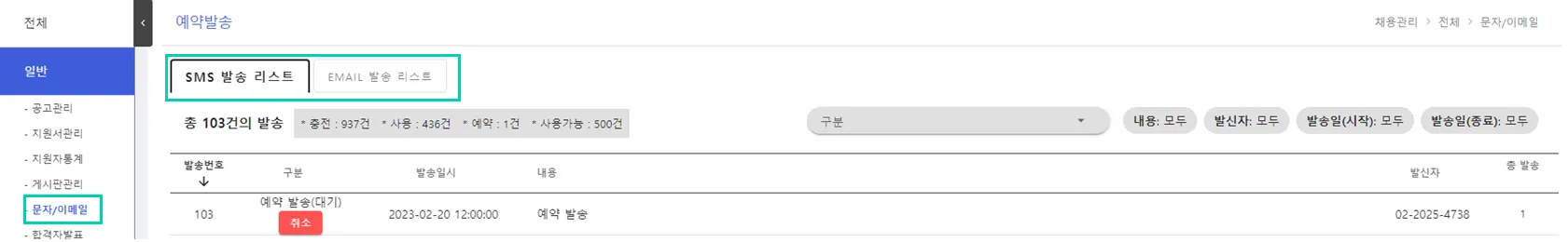 예약 발송 내역은 각 공고별 [문자/이메일] 메뉴에서 확인하실 수 있습니다.