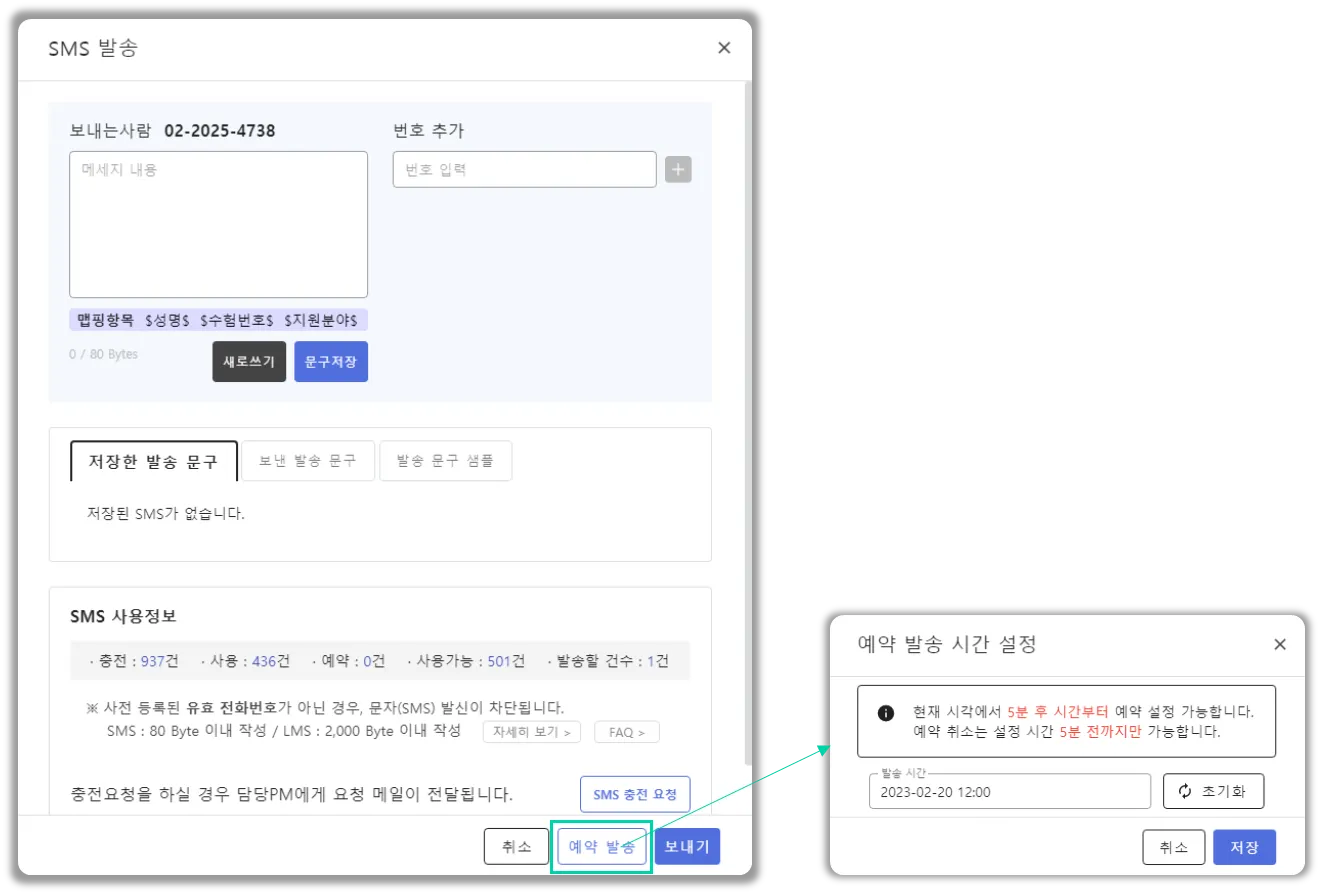 1. SMS 예약 발송 : [발송] > [SMS 발송] > 하단 [예약 발송] 버튼