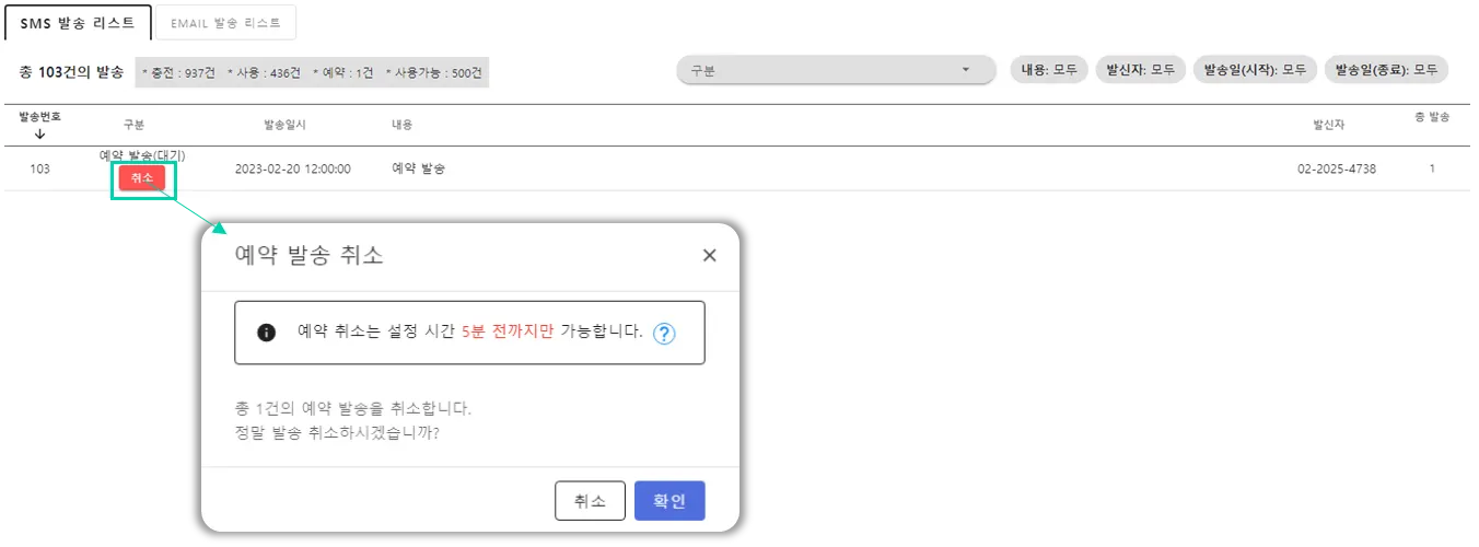 [취소] 버튼은 [문자/이메일] 메뉴의 발송 리스트에서 확인 가능하며, 발송 리스트의 발송번호 단위로 취소가 가능합니다.