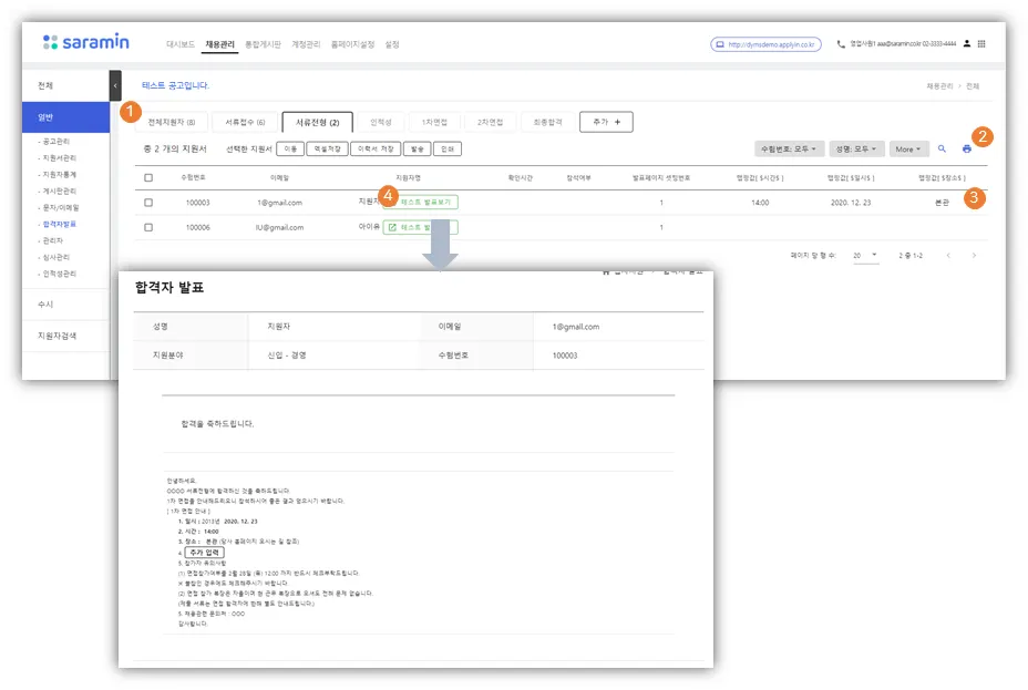 지원자 리스트에서 테스트발표 확인하기 - (테스트발표는 ④)