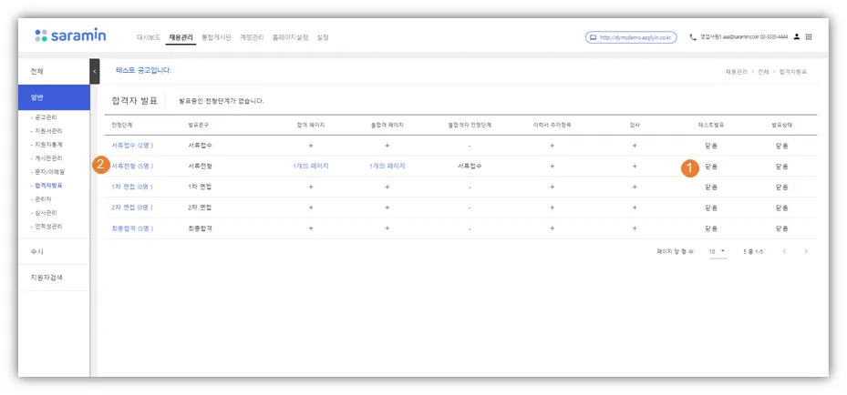 (불합격자로 지정한 전형단계의 지원자의 테스트발표 보기 클릭해보면 불합격 페이지도 확인 가능)