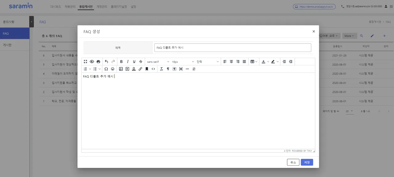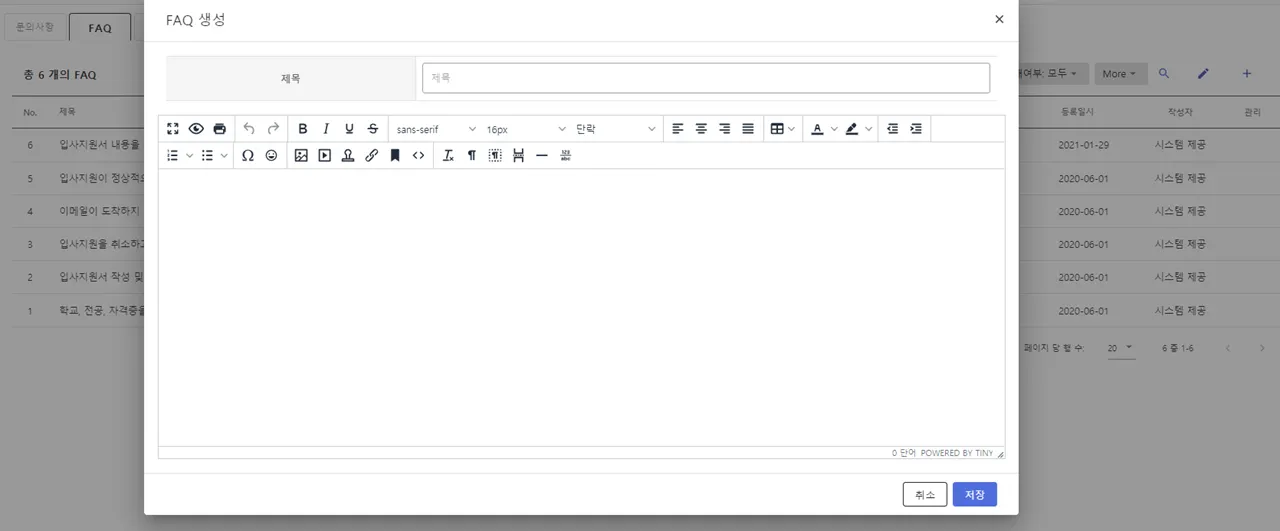 FAQ 추가 레이창에서 제목과 내용 작성 가능