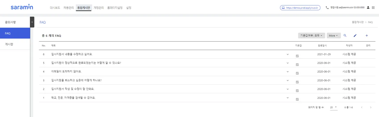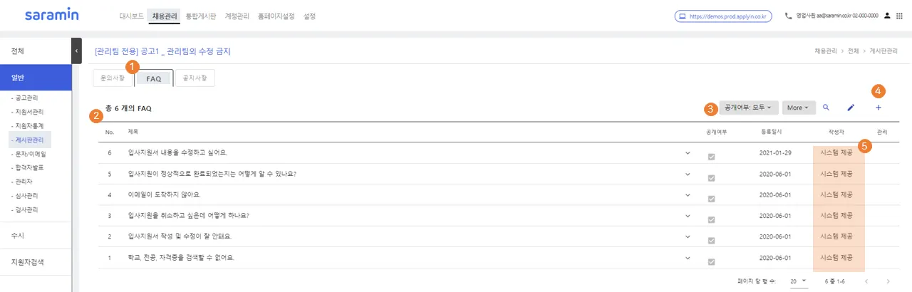① 메뉴 위치 : 채용관리(상단메뉴) > 공고선택 > 게시판 관리(좌측메뉴) > FAQ 탭 선택