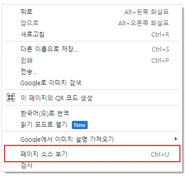 시안 밖의 흰 색 부분에 마우스 오른쪽 버튼을 클릭 및 ‘페이지 소스 보기’를 선택하세요.