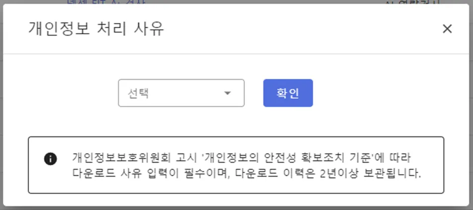 따라서, 지원자별 페이지에서 [엑셀 다운로드] 기능을 사용할 때에는 개인정보 처리 사유를 필수로