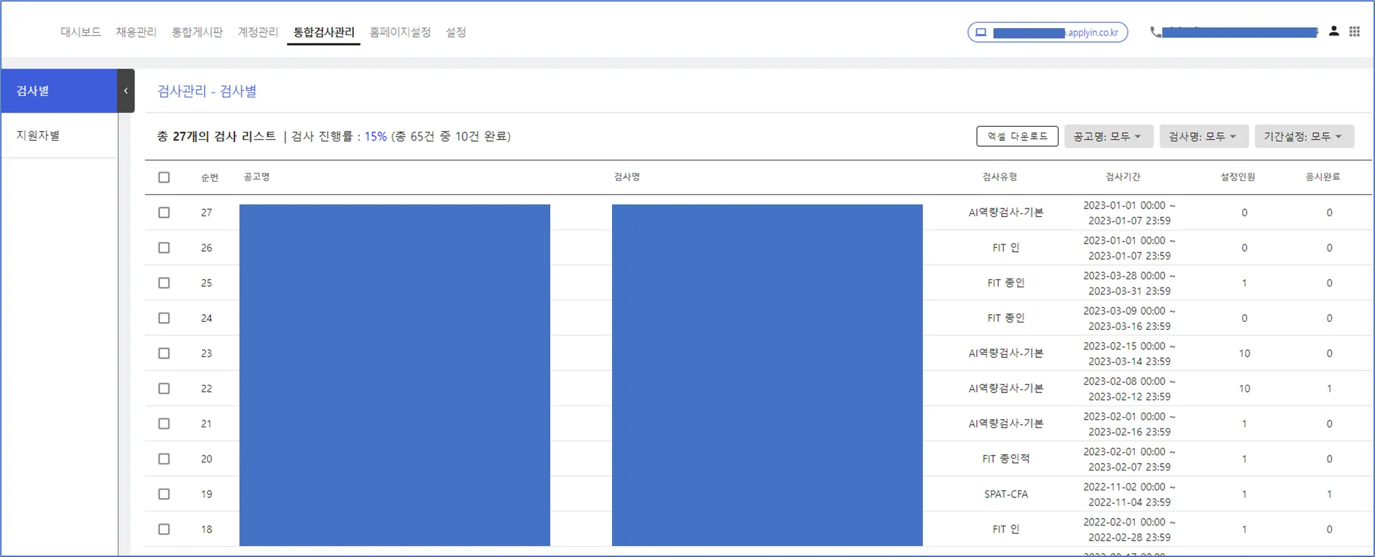 - 통합검사관리 메뉴는 인재 검증 상품(FIT, SPAT, FIT-Ai)을 구매한 기업의 관리자 계정에