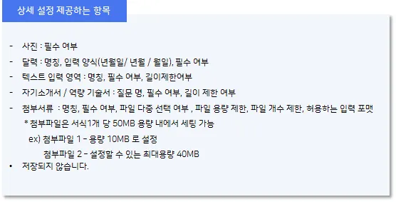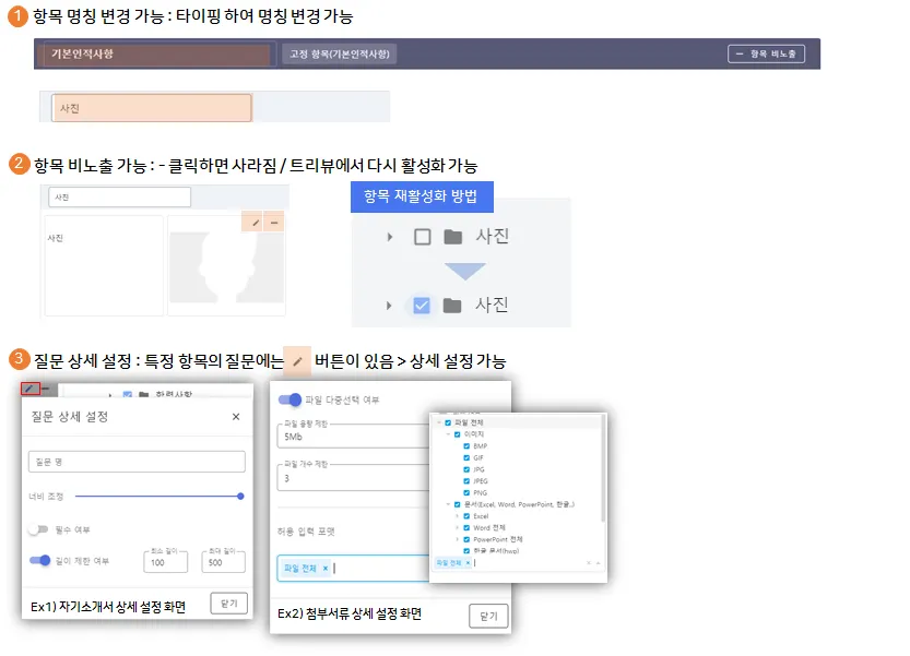 ① 항목 명칭 수정 : 입사지원서 각 항목의 명칭을 설정합니다. (변경방법 : 타이핑)