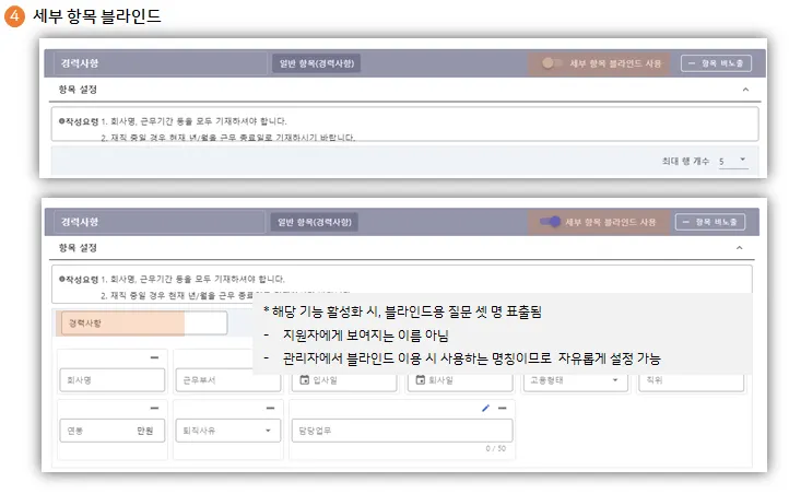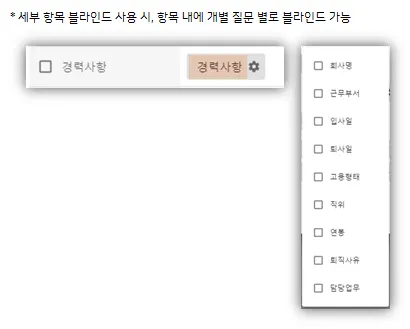 2) 사용O : 경력사항 세부 질문(회사명, 근무부서, 입사일, 퇴사일 등) 기준으로 블라인드 on/off가능