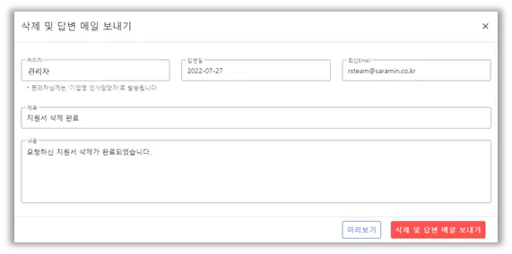 해당 지원서를 선택하여 “지원서 삭제”를 진행하면, 삭제와 동시에 답변 메일이 발송됩니다.